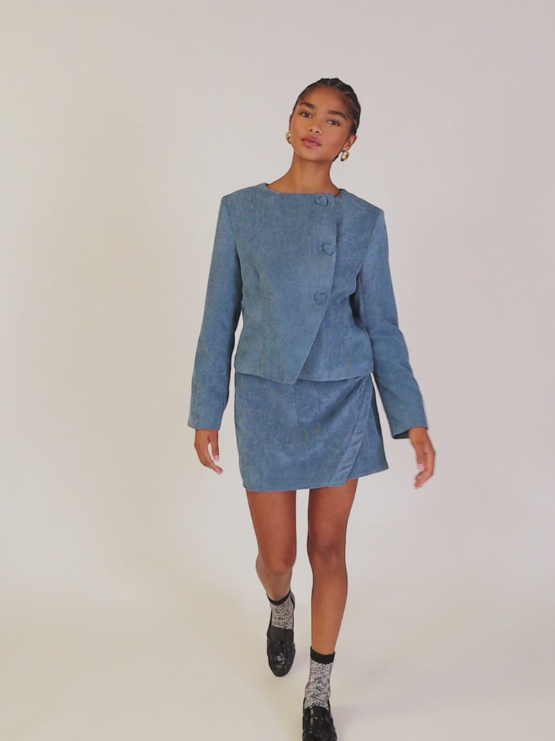 Falda mini azul con drapeado frontal y cremallera invisible en la parte trasera.