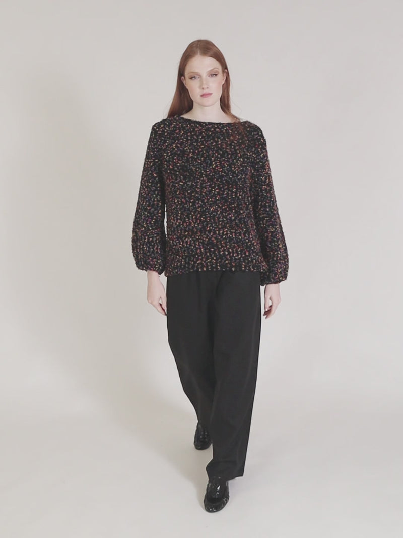 Maglione nero con mini pompon, scollo a barca, maniche a sbuffo, polsini arricciati, lunghezza fino alla vita.