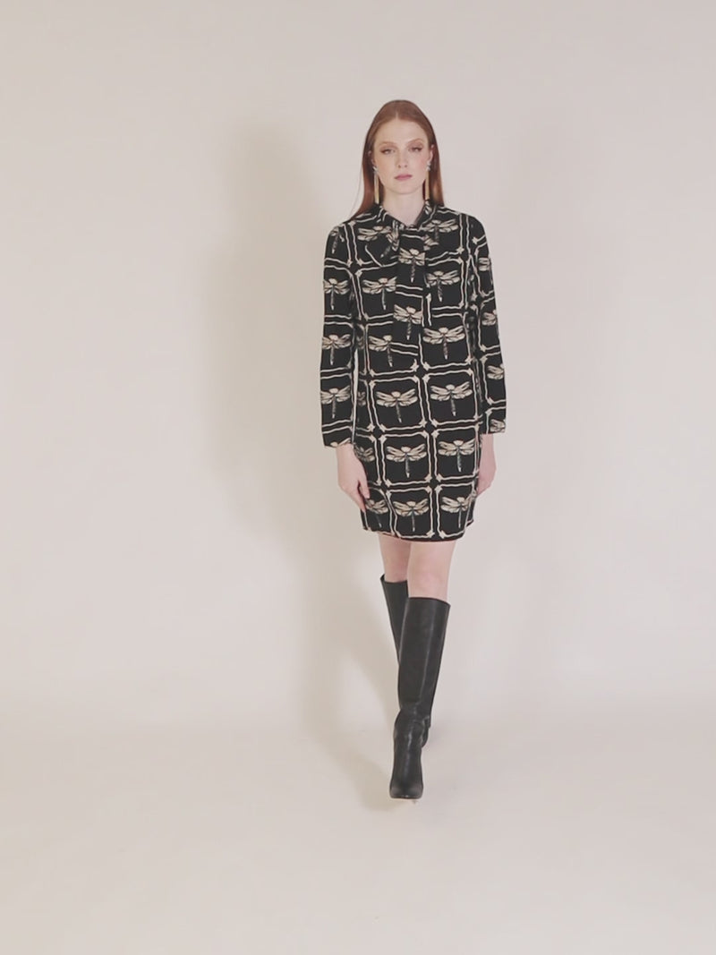 Vestido con bordado y lazada, mangas largas rectas con puño abotonado y largo por debajo de la cadera.